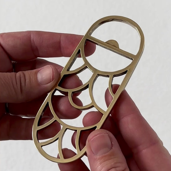 Functional can also be very, very, beautiful. This Art Deco inspired hand crafted bottle opener was carved by hand from a solid piece of wax and then cast in brass using the lost wax casting process. Each Deco bottle opener is polished to high shine and measures 4 3/8” long and 2 1/4" wide