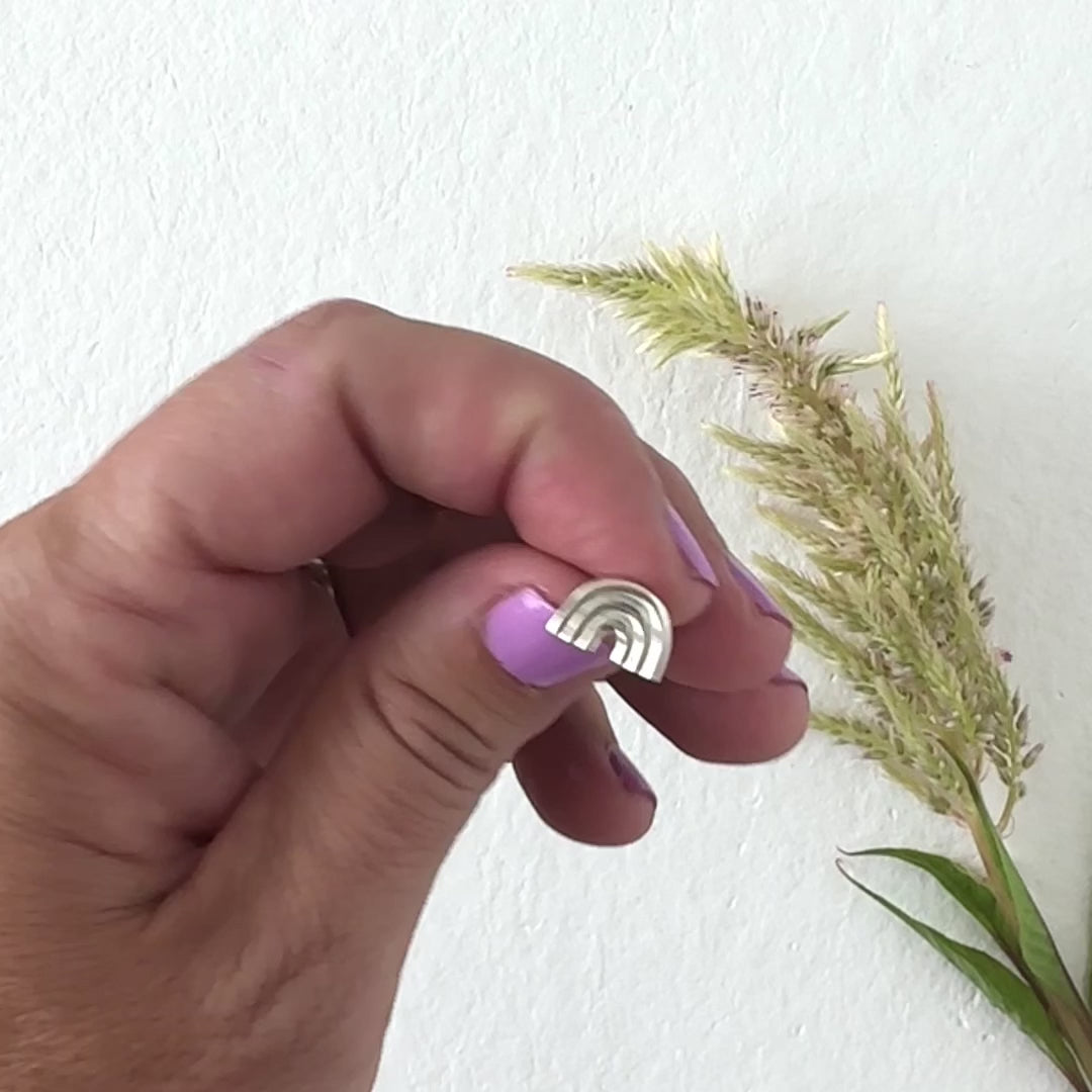 The silver Arco studs feature a sweet rainbow design hand carved from wax, cast in in sterling silver using the lost wax casting process, and then polished to a beautiful shine. Each earring is 5/16" x 1/4" and features sterling silver posts and backs.